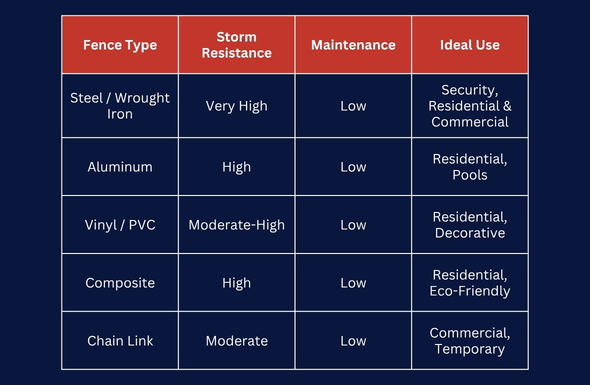 Steel and aluminum fences generally provide the highest durability against wind and hail. Composite and vinyl fences offer good resilience but require proper installation to prevent damage. Local residential fencing contractors can recommend the best solution based on property location.