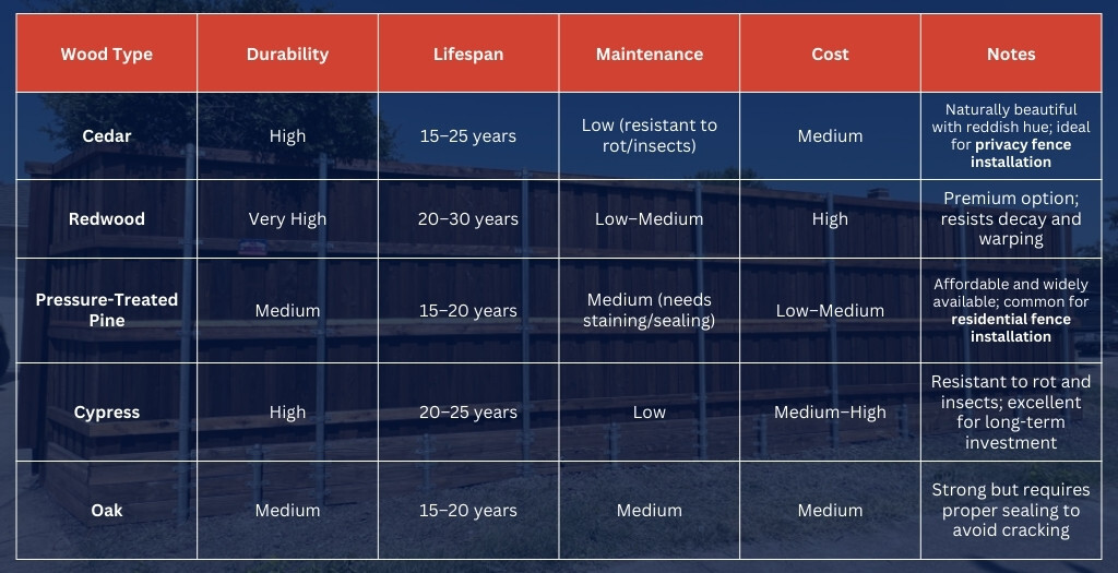 Here’s a breakdown of the best wood options for fencing in Frisco, TX:
