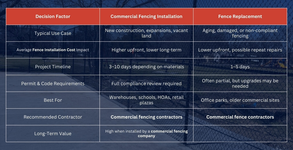 Decision Factor | Commercial Fencing Installation | Fence Replacement |