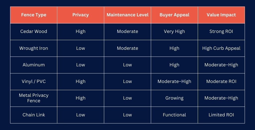 In higher-end properties, wrought iron fencing signals craftsmanship and permanence. With proper maintenance to prevent corrosion, it can last decades. While it does not provide the same privacy value as wood or vinyl, it contributes strongly to first impressions and perceived home quality.