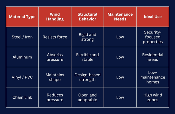 Different fencing materials respond differently when exposed to wind, rain, and debris. Instead of focusing only on appearance, it is important to understand how each material behaves under stress.
